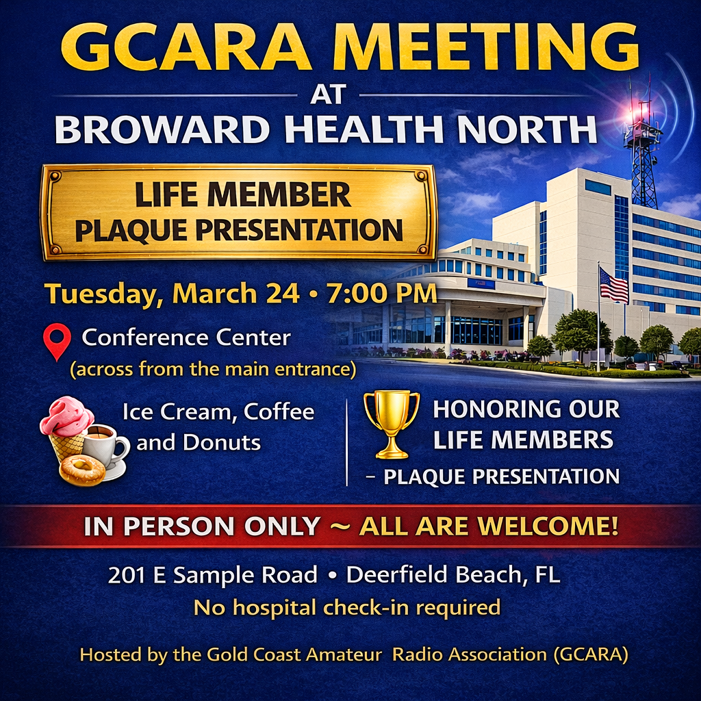 Please join us for the next meeting of the Gold Coast Amateur Radio Association on Tuesday, March 24 at 7:00 PM. This will be a special evening as it will be the first time we gather at our new meeting location at Broward Health North. A strong turnout will help demonstrate the enthusiasm and strength of our amateur radio […]